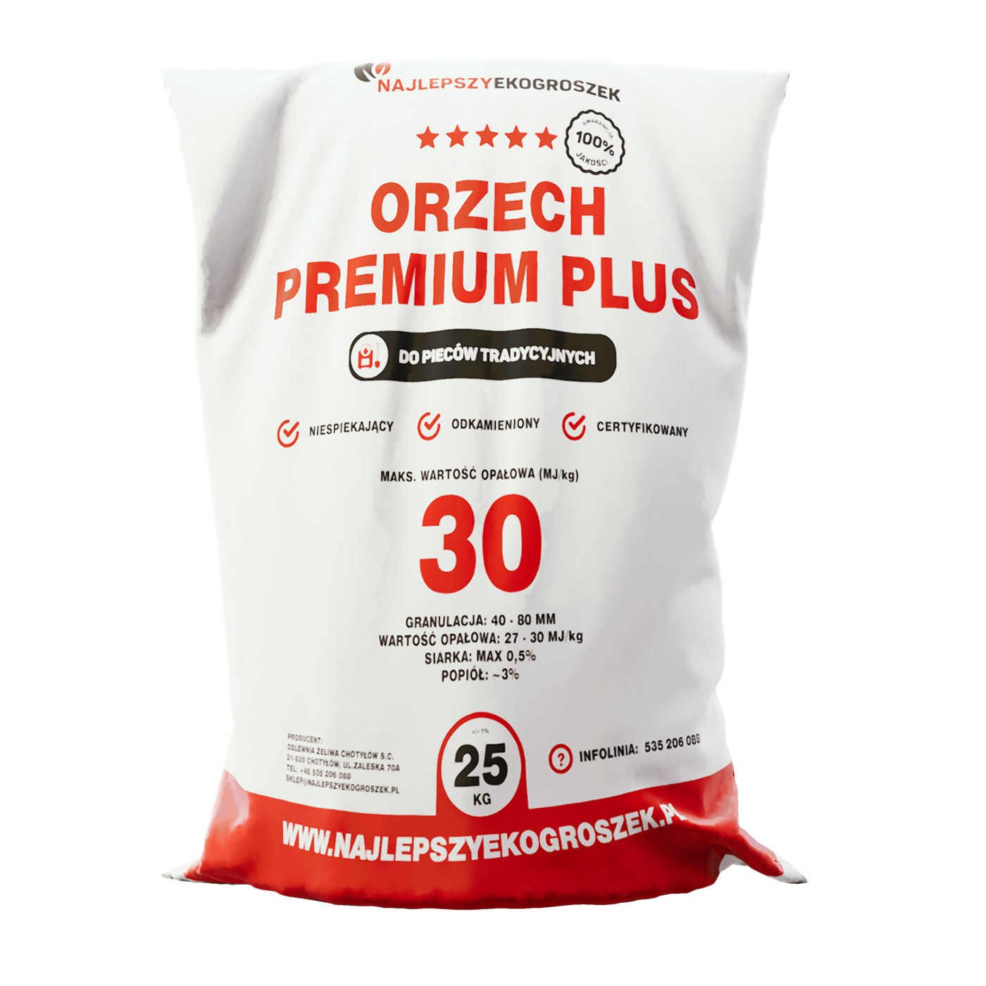 Jeśli przy wyborze opału stawiasz przede wszystkim na jego wysokie parametry spalania, to Orzech Premium Plus to zdecydowanie właściwy wybór. To absolutny top, pośród odmian węgla tej klasy. Posiada on granulację pomiędzy 40 mm – 80 mm, składając się z bryłek dających podczas spalania, potężną dawkę ciepła.